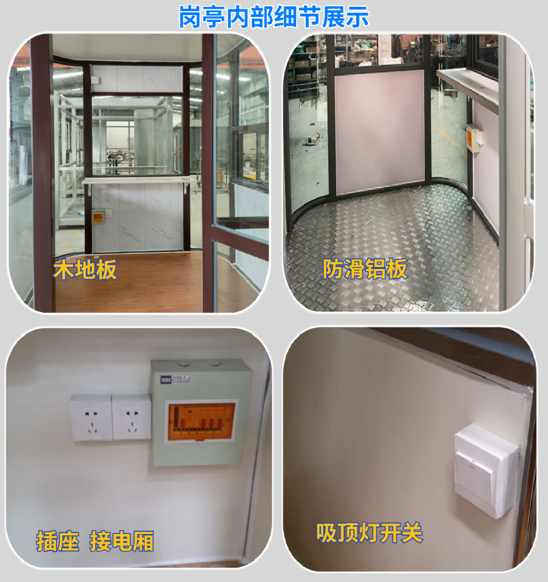 鋼結(jié)構(gòu)崗?fù)?/strong>內(nèi)部細節(jié):標(biāo)配版:PVC吊頂(選配鋁扣板)、吸頂燈、木地板(選配防滑鋁板),空調(diào)預(yù)留插座,內(nèi)部白色密度板(選配其它),燈開關(guān),接電廂,漏電保護器等。