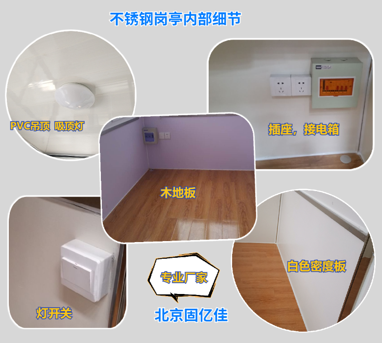 2、崗亭地板:崗亭室內(nèi)外地板采用3mm厚防滑鋁板或高強復合木地板或地塑